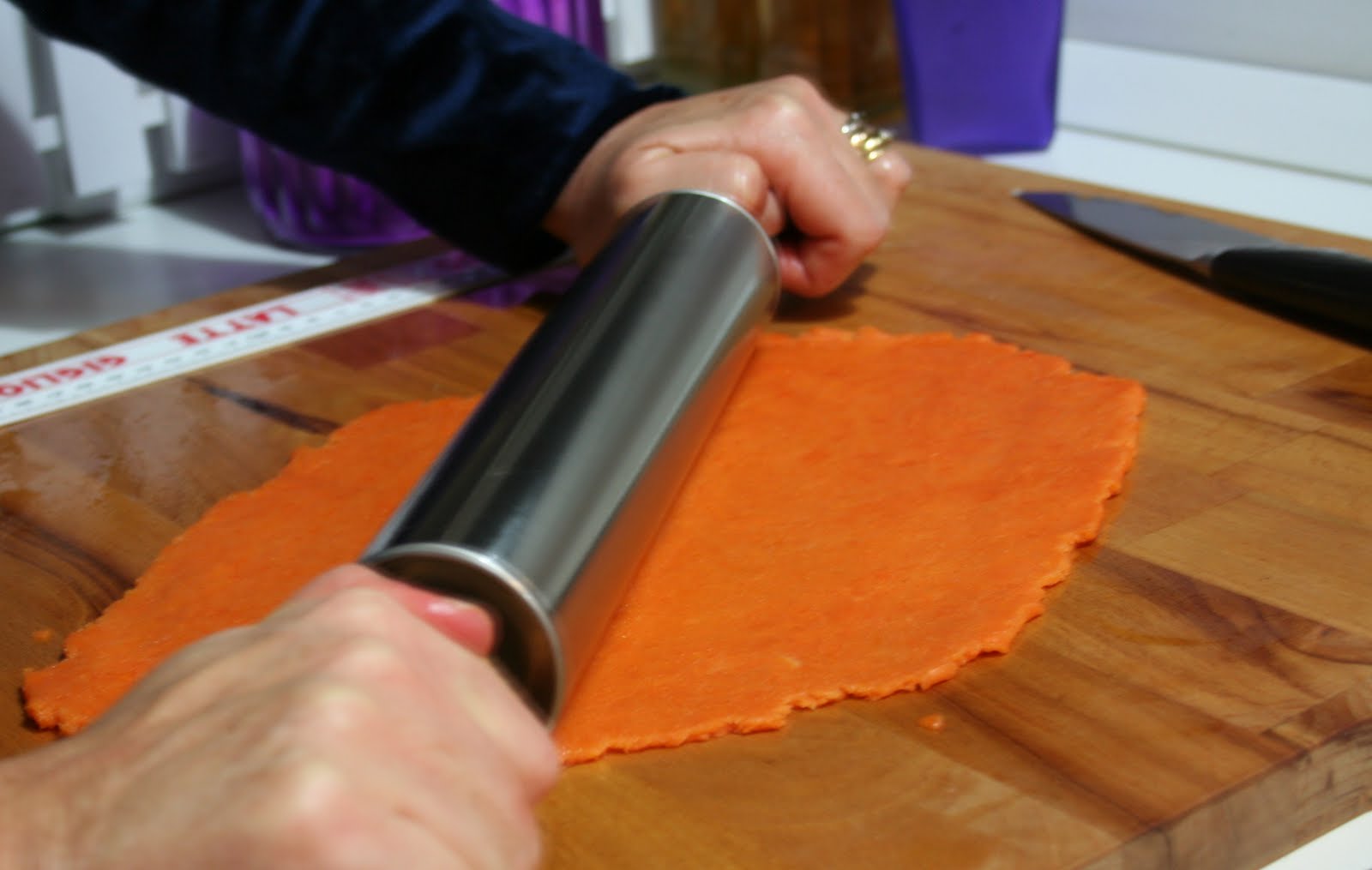Quindi stendete la pasta ottenuta con il mattarello o con il nonna papera (anche qui, io l’avevo comprata con l’intenzione di usarla e poi scopro che la sfida prevede di stenderla a mano… e non voglio aggiungere altro!). Qui vi do una dritta, all’inizio l’avevo stesa ungendo leggermente il piano con l’olio extravergine d’oliva, ma ho avuto grandi difficoltà. Poi ho deciso di provare con la farina di riso, sperando che la pasta non si asciugasse troppo. Il miracolo è stato, che non solo non si asciugata per niente, ma ne è bastata davvero poco per stenderla e renderla davvero sottile. Purtroppo l’impasto è stato fatto di sera quindi le foto sono venute sfocate e le uniche due a fuoco sono quelle che vi mostro. Ma vi assicuro che la cosa ha funzionato benissimo.