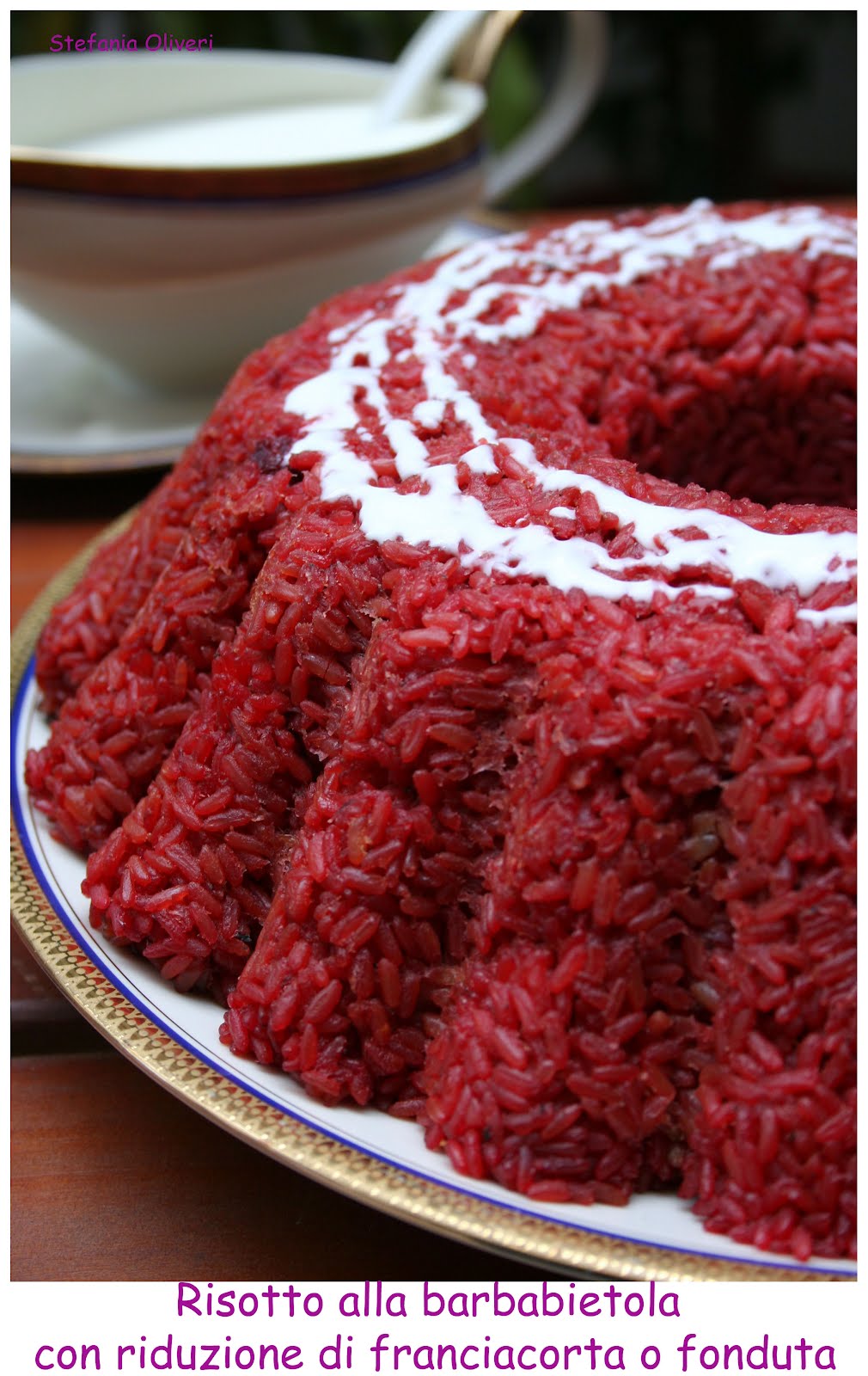 Raccogliere il succo di barbabietola in una piccola casseruola e farlo ridurre a 1,5 dl. In una casseruola a parte versare un filo d’olio, unire la cipolla tritata e fare stufare. aggiungere il riso, farlo tostare per un minuto, bagnare con il Franciacorta, lasciare evaporare e far cuocere aggiungendo gradualmente il brodo bollente, solo per 10 minuti il riso, in maniera che si mantenga integro, quando si passa al forno in cottura. Spegnere la fiamma, mantecare con del burro e il grana. Aggiungere il succo di barbabietola ridotto e mescolare per 5 minuti. Imburrare uno stampo a ciambella e versarvi il riso. Metter in forno a 180 gradi per una ventina di minuti.Finitura
