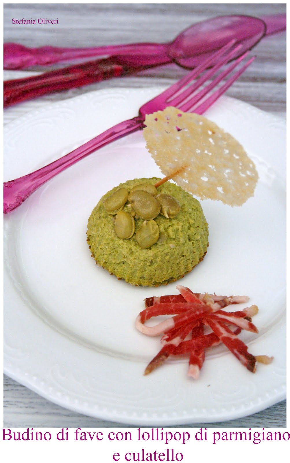 Budino salato alle fave con lollipos di parmigiano e culatello