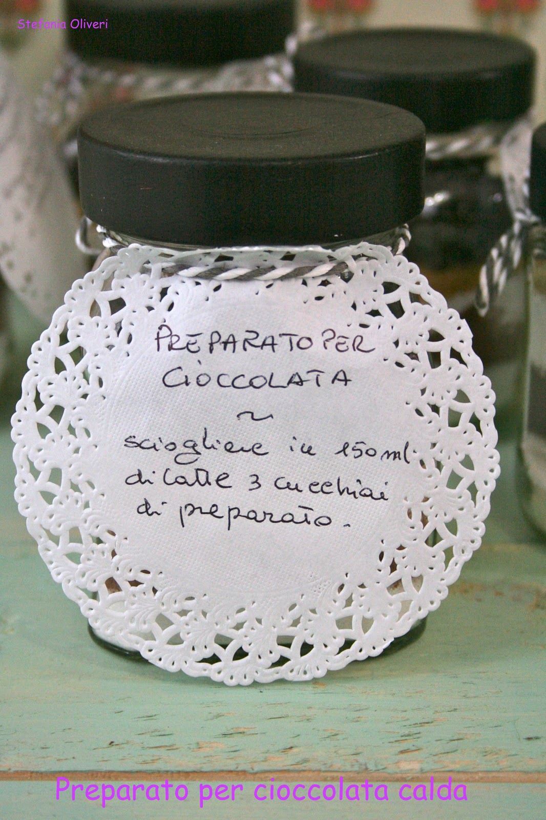 Per questo io ho raccolto tutti i barattoli più belli che ho usato durante l’anno, li ho puliti, sterilizzati e conservati. Ho poi dipinto il coperchio con un colore nero lavagna,volendo si può scrivere qualcosa con i gessetti e se avete una buona calligrafia – non come la mia – potete scrivere le istruzioni proprio sul tappo. Altrimenti, fate come me e utilizzate un centrino in carta per cupcakes.