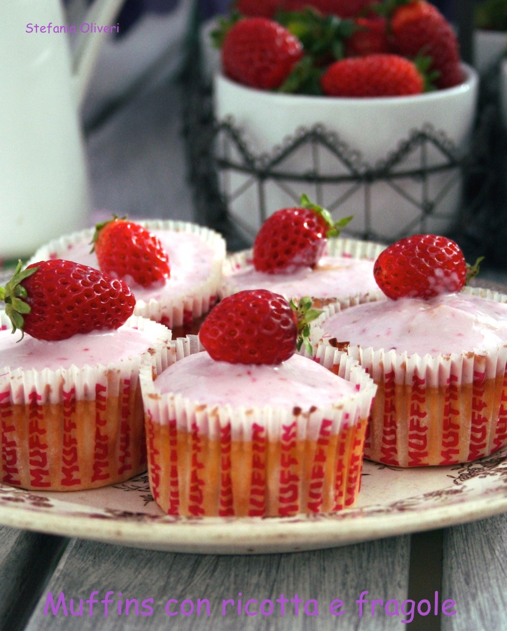 Mescolate la ricotta allo zucchero e frullatela insieme alle fragole. Quindi distribuite sulla superficie dei muffins e decorate con una fragola.Vi ricordo che se volete acquistare il mio libro, lo trovate già qui